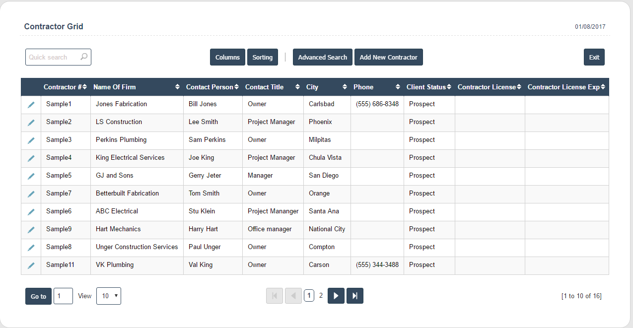 Displays a list of contractors entered into SuretyPro. List can be sorted, filtered, and searched to locate your contractor.