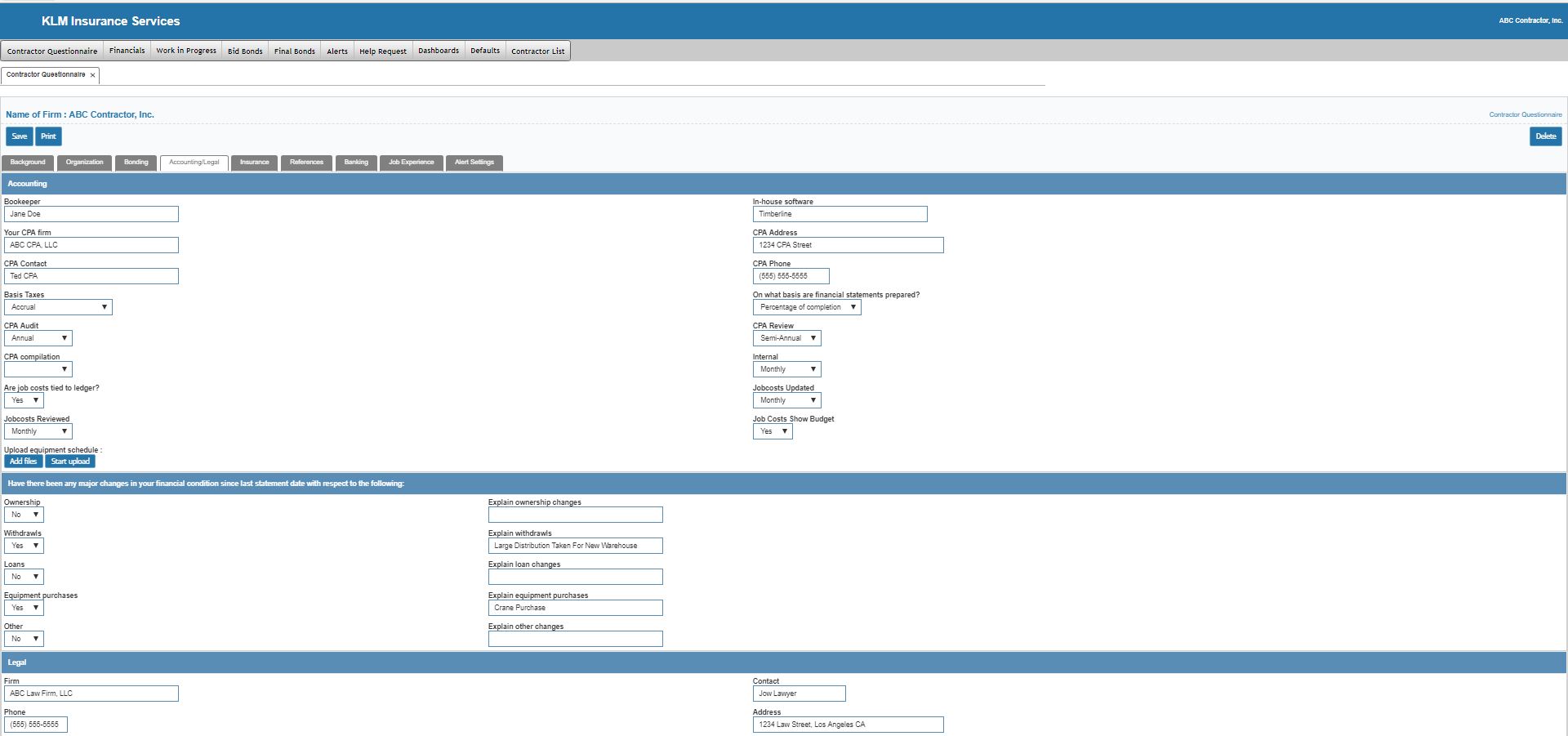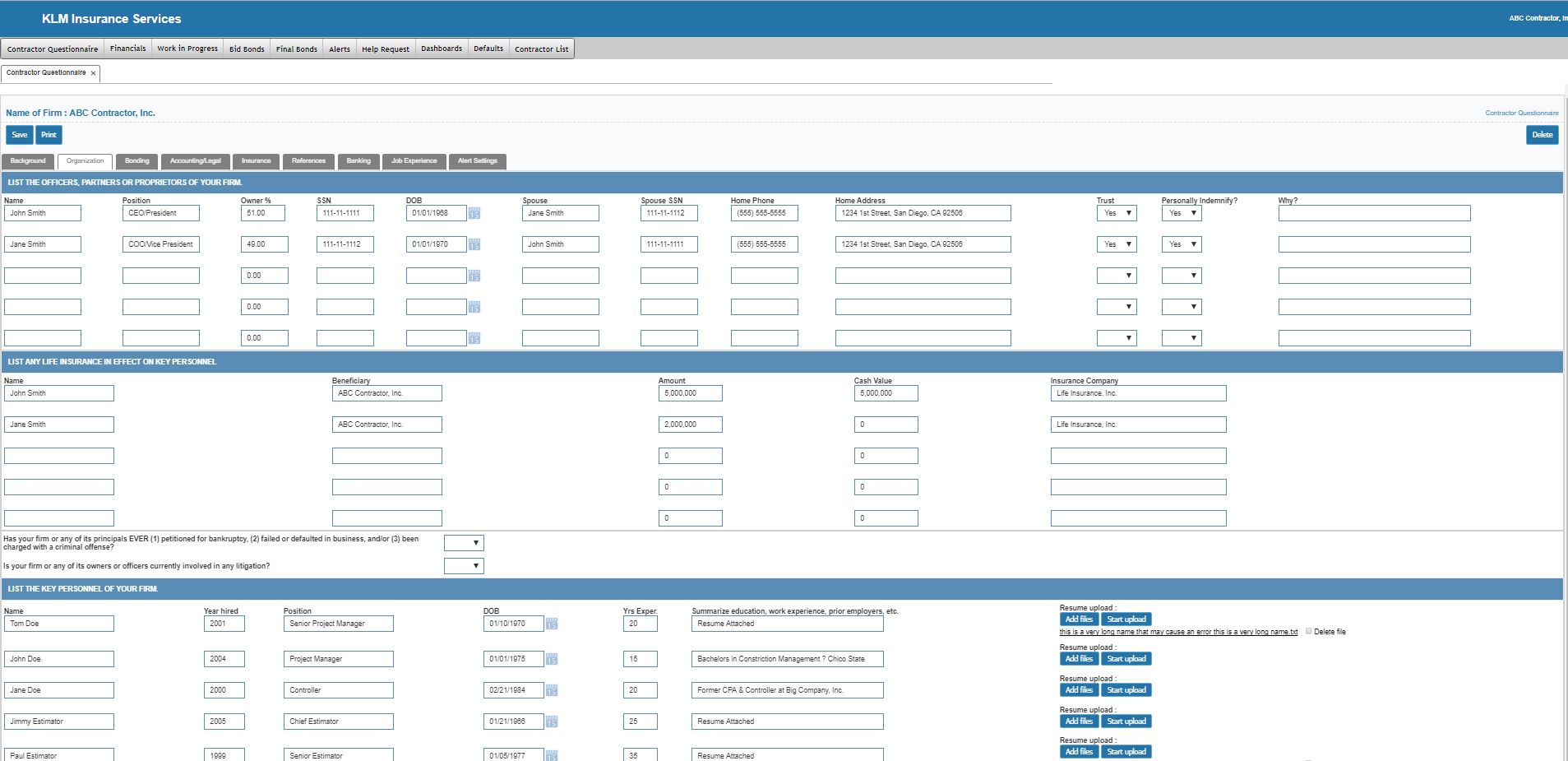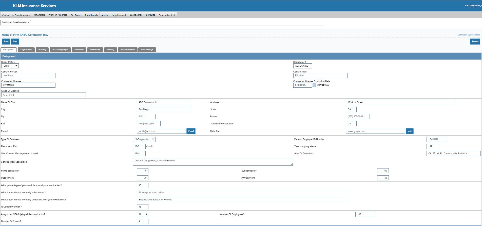 The Contractor Questionnare module allows you to enter key information related to your contractor's structure, background, key employees, officers, banking, bonding, and job history.