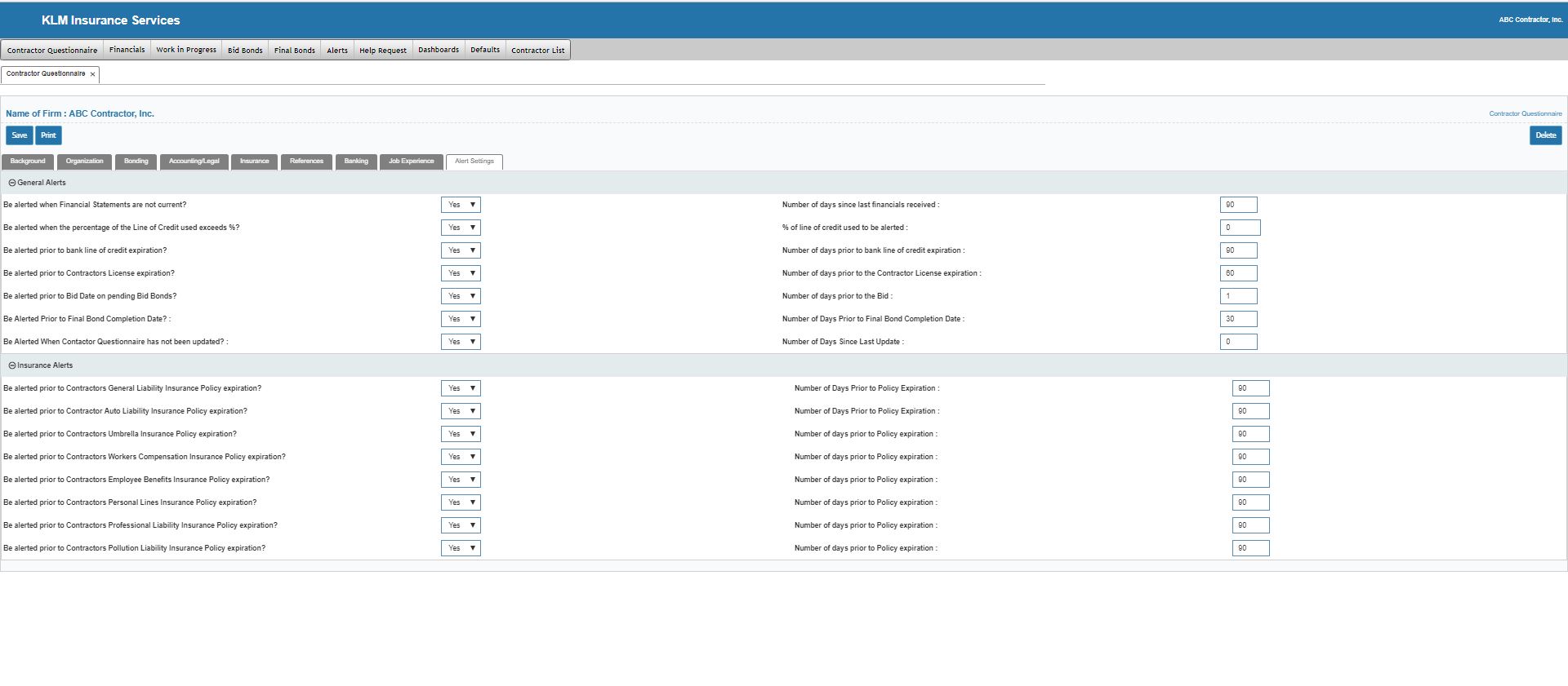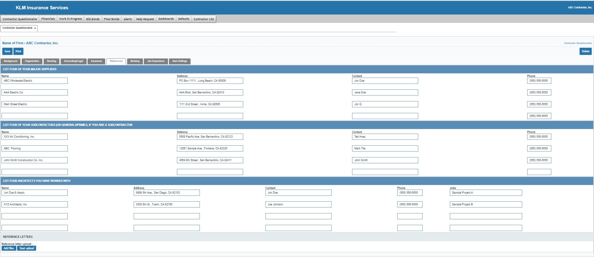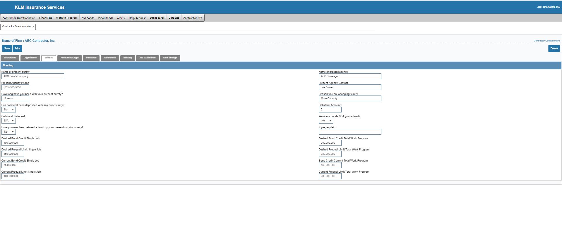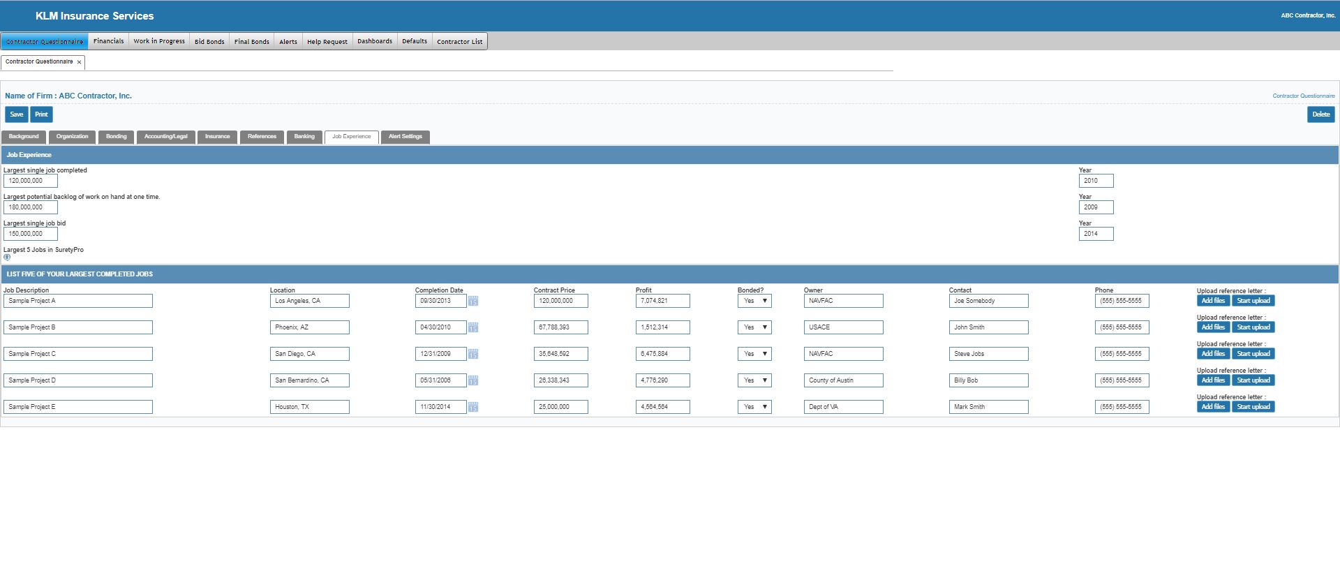The Contractor Questionnare module allows you to enter key information related to your contractor's structure, background, key employees, officers, banking, bonding, and job history.