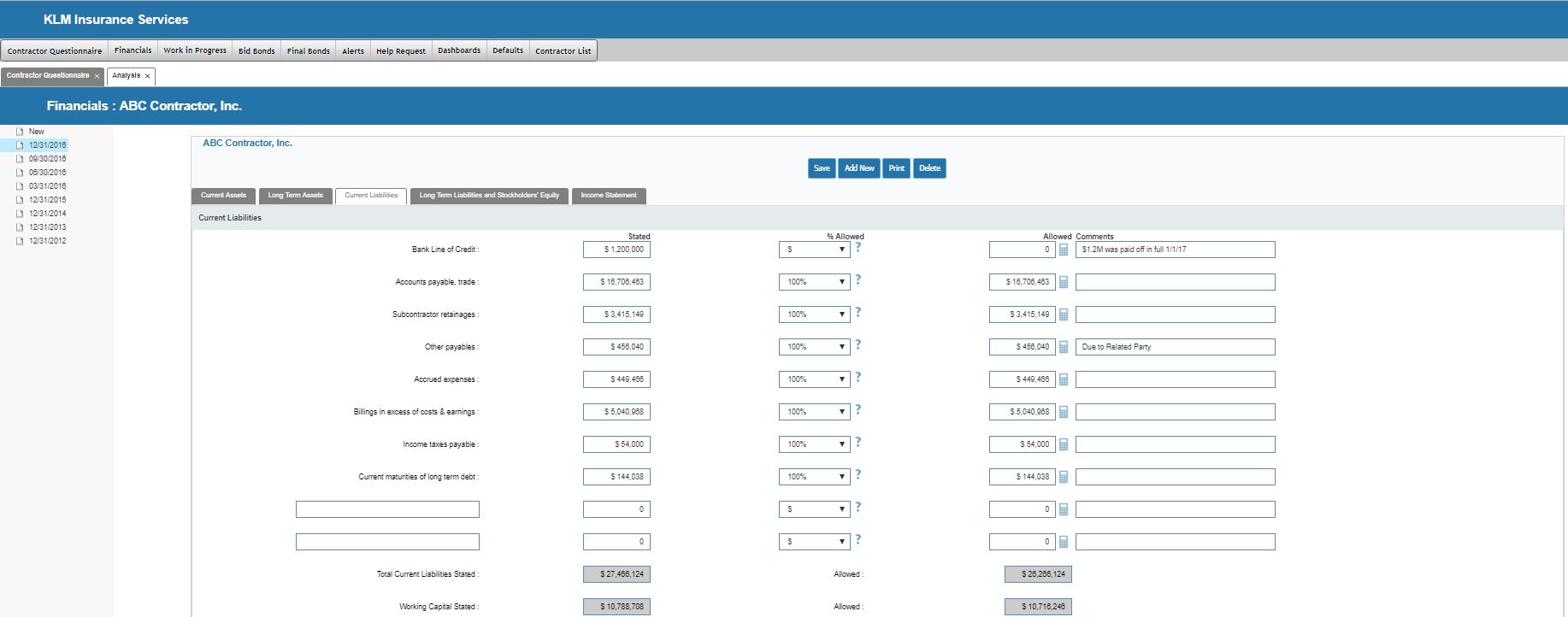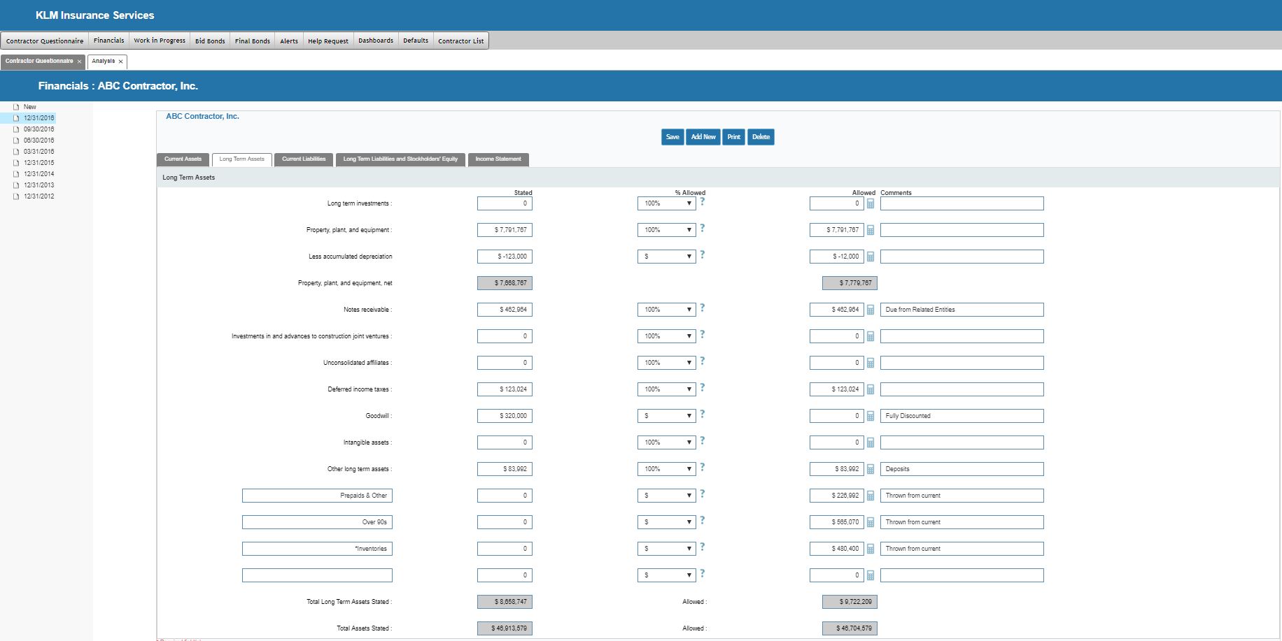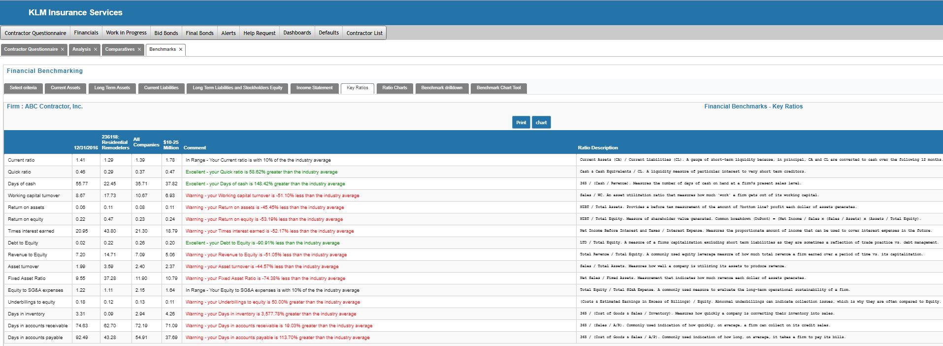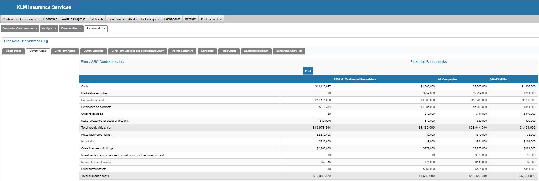 The Financial Module allows the user to underwrite client’s financial information on a secure easy-to-use system that mirrors many of the credit modeling systems utilized by today’s top surety companies. The user can generate instant exclusive, flexible and credible financial reports with in-depth analysis including comparative analysis. Another unique feature of this Module is the ability to generate industry benchmarking reports that compares your clients’ performance side-by-side with peer groups.