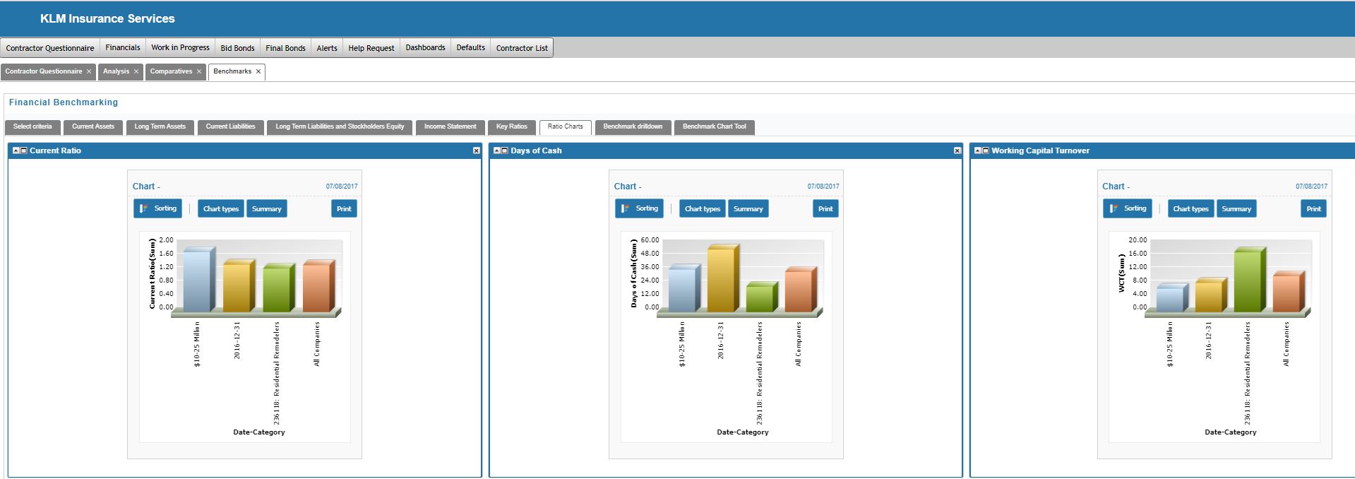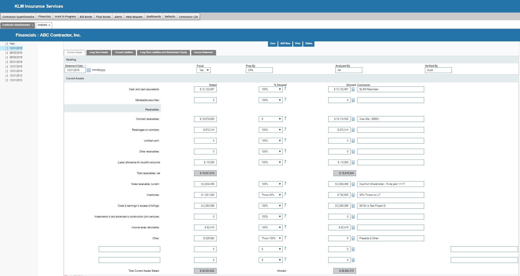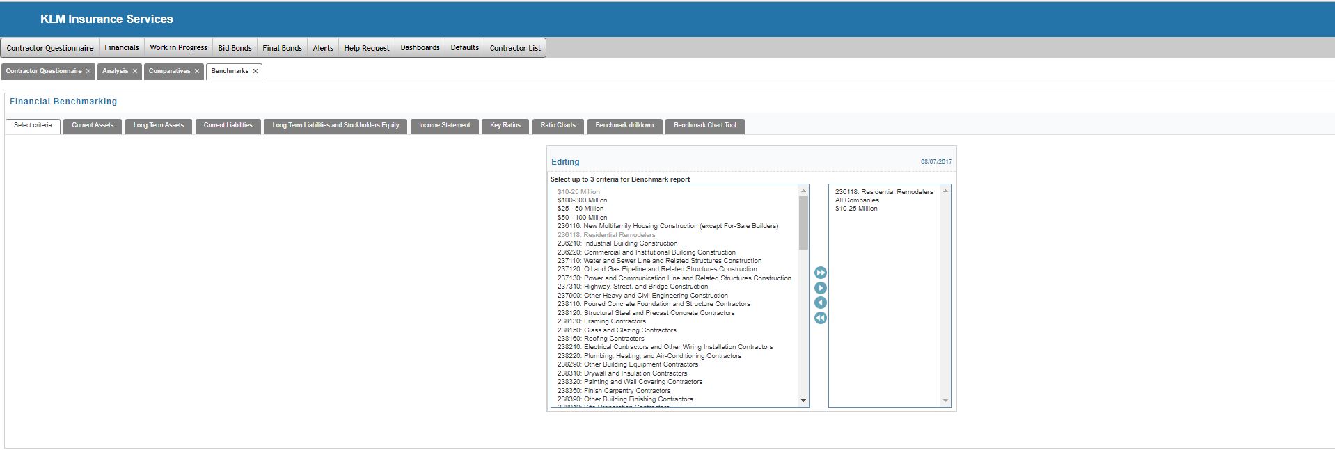 The Financial Module allows the user to underwrite client’s financial information on a secure easy-to-use system that mirrors many of the credit modeling systems utilized by today’s top surety companies. The user can generate instant exclusive, flexible and credible financial reports with in-depth analysis including comparative analysis. Another unique feature of this Module is the ability to generate industry benchmarking reports that compares your clients’ performance side-by-side with peer groups.